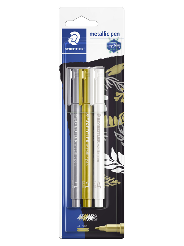 Vi har fundet Staedtler Staedtler Metallic Pen 2 1 Bk fra Staedtler hos Proshop.dk i kategorien Skrive Og Tegnevaerktoejer. Staedtler Metallic marker. 3 stk på blisterkort. Farve: guld/sølv/hvid. Stregbredde 1-2 mm. Velegnet til skrivning/tegning/dekoration/scrapbooking mm. Farven kan ses på mørkt papir/karton.