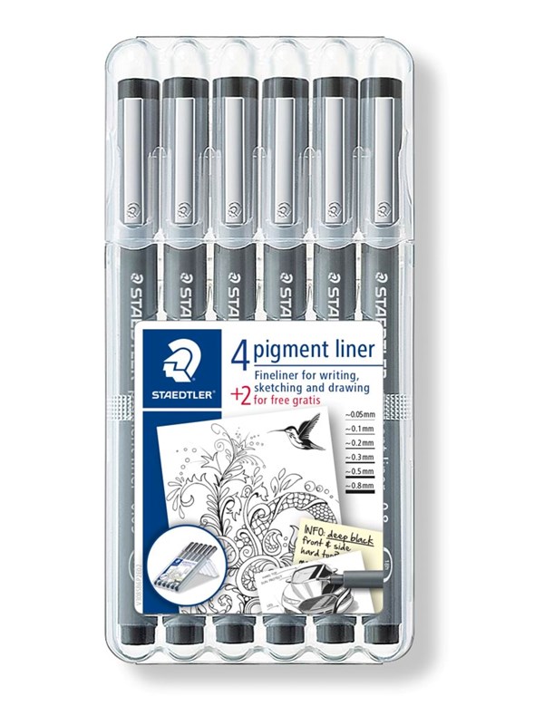 Vi har fundet Staedtler Staedtler Pigment L 4 2 Ass Boks fra Staedtler hos Proshop.dk i kategorien Skrive Og Tegnevaerktoejer. STAEDTLER® Pigmentliner -Til skrivning, skitsering og tegning. -Lang metalspids, ideelt til brug med linealer og skabeloner. -Lysægte og vandfast-Trænger ikke gennem papir. -Dokumentægte og perfekt til underskrivning på mange emner så som kreditkort, pas